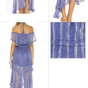 Viscose blend. Hand wash cold. Partially lined. Adjustable tie halter neck. Elasticized off the shoulder styling. Metallic threading throughout.