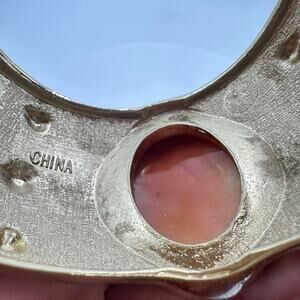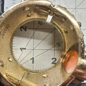 Excellent condition, no flaws. This statement clamper bangle bracelet features a large hand carved shell cameo set into embossed 14kt gold plating and slick black enamel. Width is just over 1.5”. Please see photos for inner diameter measurements in inches.