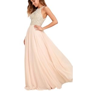 Beaded Maxi Dress! A halter neckline (with clasp closures) tops a dazzling beaded bodice, with sequins and rhinestones, padded cups, and sultry front and back cutouts. Lightweight, blush Georgette flows from a fitted waist into a full maxi skirt. Hidden back zipper/clasp. Fully lined. Gorgeous dress for prom, sweet 16, cruise, mother of the bride/bridal party, this beautiful ball gown can be worn to any major formal event! Size 4 NWT!