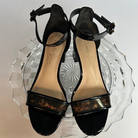 Keywords: Amelia Grace, black sandals, ankle strap heels, block heel sandals, tortoise strap, dress sandals, women's footwear, party shoes, evening wear, formal sandals, stylish heels, comfortable heels, adjustable strap, black and brown, wedding guest