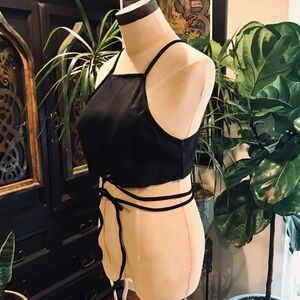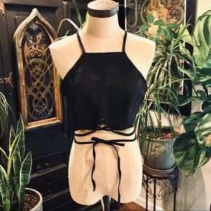 Amelia black faux suede wrap tie halter top. Fully lined. Displayed on a size small dress stand. Materials and sizing tag not available. Polyester blend. Boho chic, festival Season, beachwear, retro bohemian hippie vibe