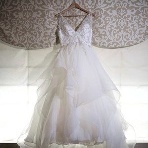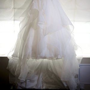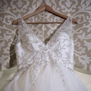 Plunging Princess Wedding Dress. A dramatic princess wedding gown with horsehair layered ballgown skirt, featuring a breathtaking bodice adorned with Swarovski crystals and pearls, plunging illusion V-neckline and back. Finished with crystal buttons over zipper closure. Color is Ivory. US. size 12. Minimal alterations, discrete added crystals to pin up train for dancing. Professionally cleaned. I'm 5'3 and wore 3 inch heels.