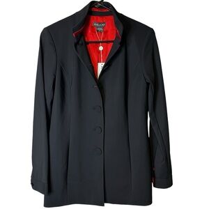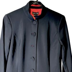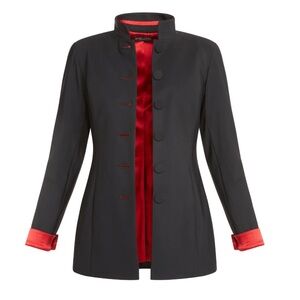 Ameliora The Carmen Silk Lined Mandarin Collar Jacket NWT See Button Size 6. Brand new with tag - extra button included to replace missing one. This jacket is so extremely smooth! The sleek Jacket is a bold statement piece with mandarin collar, cloth-covered buttons, and elegantly-proportioned shoulder pads, full silk lining very luxurious. Fitted with generous silk pockets. Whether you wear this versatile jacket buttoned, unbuttoned, or cuffed, the Carmen elevates every look, from your workwear to your favorite jeans.