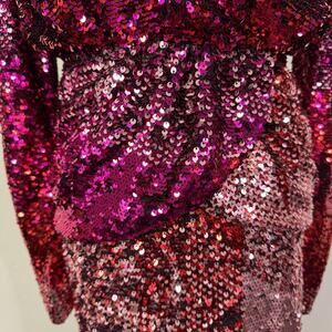Turn heads in this dazzling Amen Pink Degradé Sequin Mini Dress, new with tags. Featuring an ombré sequin finish that shifts from blush to fuchsia to deep rose, this glamorous piece is perfect for parties, cocktail evenings, or standout events. Designed with long sleeves, a plunging V-neckline, and a figure-skimming silhouette, it balances drama with elegance. The fully lined construction ensures comfort while the sequin embroidery brings high-impact shine. A rare find, this dress embodies modern luxury with a playful, statement-making edge.