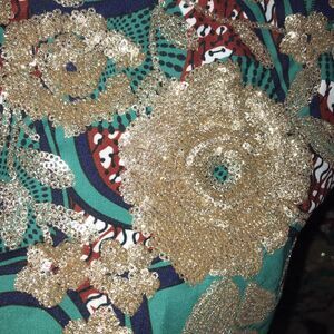 Gorgeous showstopper statement piece dress. Covered in gold beaded flowers. French size 2. About a US size 6 (see photos for approximate measurements in inches). Sleeves are open at the bottom.