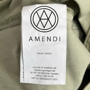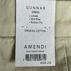 Amendi Gunnar in Green Organic Cotton Pleat Front Button Fly Pants - NEW Size 34. New with brand tag. Sold at Nordstrom. House of Amendi is a Swedish brand and their clothing is extremely nice and very well made. Straight leg, loose fit, button fly, pleat front, 2 front slip pockets, 2 back welt pockets with button closures, 100% organic cotton. Approximate measurements: 19" waist, 13 3/4" rise, 32" inseam. These came to me in a pallet so it's very possible that they have a little pallet dust on them from their travels.