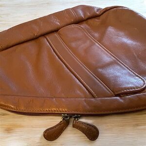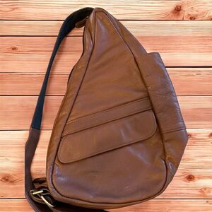 Keywords: AmeriBag, sling bag, leather bag, chestnut brown, unisex, vintage, extra small, Velcro closure, magnetic closure, multiple pockets, trapezoid shape, pre-owned, casual outings, daily errands, Travel, Daytrip, cruise, Hiking, outdoors, Daily essentials, Cruise