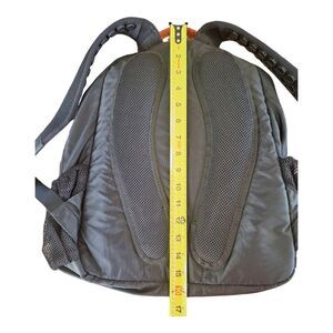 New without tags, this Ameribag backpack contains multiple compartments, including a pocket to fit an 8 x 10 tablet. Three outer zipped compartments plus the main large compartment. Water bottle pockets on each side. Sturdy durable black nylon with orange accent. Cushy padded back with unique rubber details on the adjustable straps.