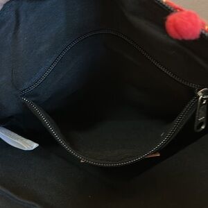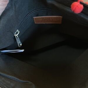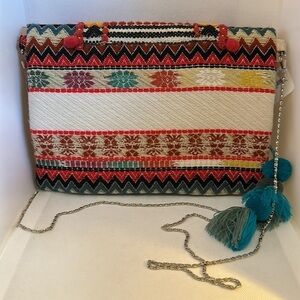 Super cute and colorful embroidered bag with beading and pompoms. Fold over top entry with zipper closure. Interior zip pocket. Crossbody length removable chain strap. Smoke free home.