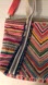 Vibrant beaded and sequin embellished tote bag from America Beyond. This tote features a chevron pattern done in colorful beads and sequins. This fabric bag has a double handle and an adjustable and removable pink crossbody strap. The inside is lined in blue and features a zippered pocket and two open pockets.