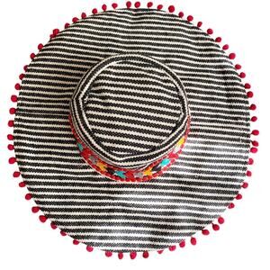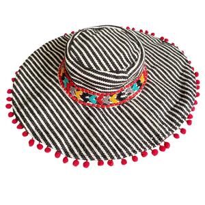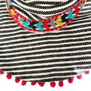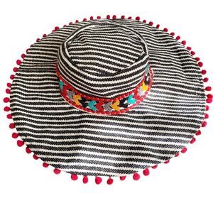 Black and white stripes make up this 5" wide brim boho hat with red pom edge fringe. Beaded detail band. 100% cotton. 22" circumference = Size 7 or Medium. NWT. Great beach or vacation hat.