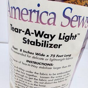 The America Sews Tear-A-Way Light Stabilizer offers essential support for embroidery projects on delicate or lightweight fabrics. With its 8-inch by 75-foot roll, it ensures ample supply for extended use. Its tear-away design facilitates easy removal, maintaining the integrity of your fabric. Ideal for professional sewing tasks.