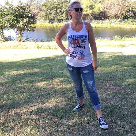 America = USA Fireworks freedom Stars and Stripes! This is the perfect tank to show your pride! 95% Rayon 5% Spandex MADE IN USA!