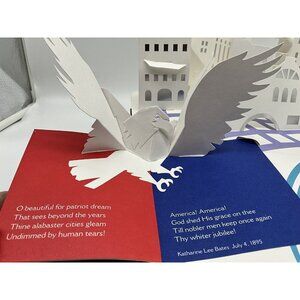 *The pop-ups follow the song "America The Beautiful"; The Golden Gate Bridge, For Amber waves of grain, For purple mountains majesties (Mount Rushmore), Above the fruited plains, God Shed His grace on Thee, And crown They good with brotherhood, From Sea to Shining Sea (Statue of Liberty)