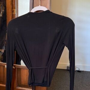 Chic black wrap blouse. Long sleeves with a stylish tie front. Perfect for versatile styling.