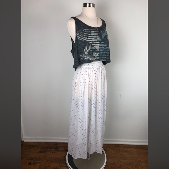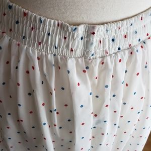 American Apparel White Ankle Skirt, Blue/Red Polka Dot detail, Elastic Waistband, Sheer, Preloved and EUC, Size XS/S. Great item to style for festival season