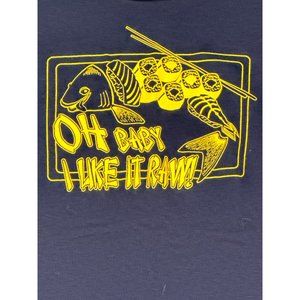 This American Apparel medium size youth graphic tee is a must-have for sushi lovers. The blue crewneck tee features a playful "Oh Baby I Like It Raw" sushi design.