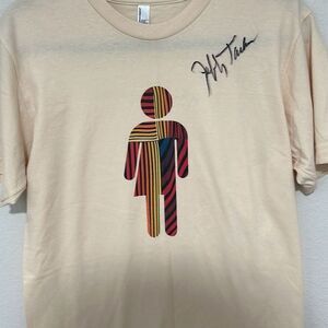 The American Apparel Mens Cream Graphic Print T-Shirt in Size Medium is a classic wardrobe staple with a twist. This signature piece features a unique design signed by Jeffrey Tambor, known for his role in Transparent, an Amazon Original TV Show from 2014-2019. The #BeTransparent print at the back adds a cool, edgy vibe to this timeless tee.