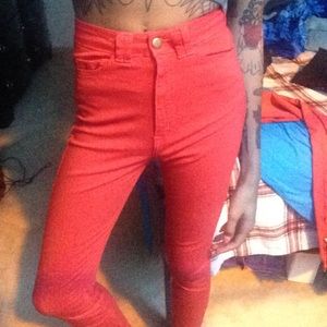 American Apparel Four-Way Stretch High Waist Side Zipper Jean in Balloon Red. Size 24/25 and new with tags! Never worn and no visible defects. $28 shipped on Mercari. 🚫 No trades, only selling. 🚫