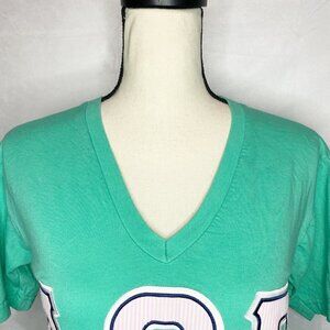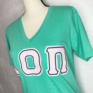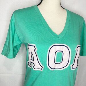 Vibrant teal tee with bold white lettering. Comfortable short sleeves. Perfect for casual wear.