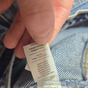 Details: medium marble wash, high waisted, no stretch, front and back pockets, zip fly, straight leg
