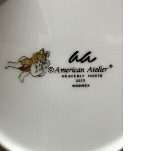 Once upon a time, embellishing the tables of those who cherished elegance, the Heavenly Hosts plate by American Atelier made its entrance. Decorated with cherubic figures draped in golden ribbons, it was more than a mere plate; it was a testament to artistry. Crafted in Indonesia, this 8-inch masterpiece whispered tales of celestial beauty and timeless grace.