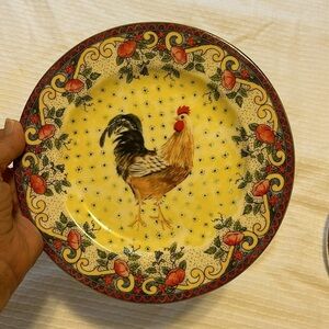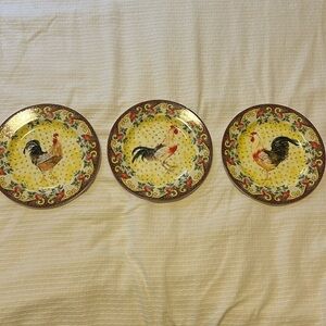 American Atelier Petite Provence Rooster Accent Salad Plates. Approx diameter: 8”. Set of 3. Great as decorative accent or use as a dining plate. See all photos for scratches/signs of wear. Overall, very good condition