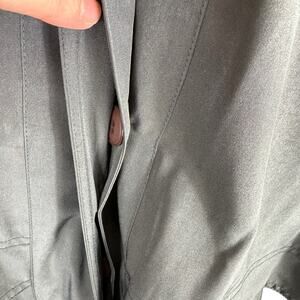 Excellent preowned condition. Gray long lined mock neck hidden button up front jacket. Has large open pockets at waist. Top button & button on neck are visible, the rest are hidden. Has padding in shoulders. Button-off lining is not as long as coat (see picture 8). Shell is polyester, lining is nylon, button off liner body is acrylic, sleeves are cotton/acrylic. material. Approx. measurements: Shoulder to hem 50", pit to pit 24", sleeve from neck to sleeve hem 29". Size 10.