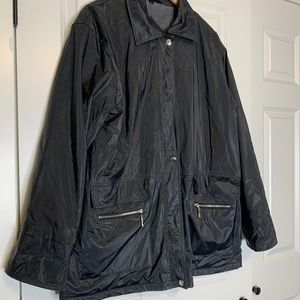 Black coat/wind breaker lined with both buttons and a zipper. In size Large from American Bazaar