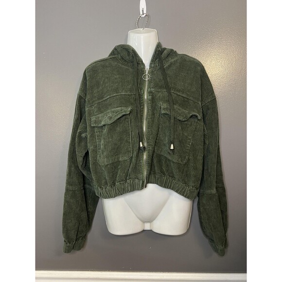American Bazi Jacket Womens 1X Green Corduroy Hooded Zip Cropped Flap Pockets