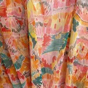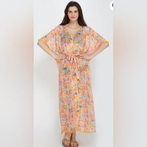 Bat style sleeves with side slits and adjustable tie belt at waist.