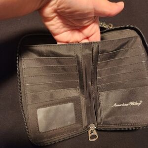 American Bling Black Faux Leather Studded Crossbody Phone Wallet Purse, has 11 card slots, 1 ID slot, 1 cash slip pocket, zip around closure, adjustable strap, snap button closure for cell phone, minor flaw on corner of cell pocket please see photo, otherwise in good pre-owed condition.