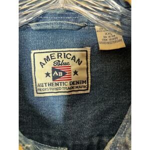 American Blue Authentic button down shirt. Denim top with a collared neckline and cuffed sleeves. Button top pockets, with long sleeve. Could be worn as an oversized shirt shacket and be unisex.
