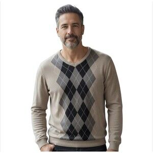 The American Blue Men's Argyle Sweater in Tan and Brown Plaid is a stylish and versatile piece perfect for casual occasions. Made from a luxurious silk blend, this sweater features a V-neckline, long sleeves, and a tight-knit construction for a classic argyle pattern. The sweater is designed with a regular fit and is suitable for all seasons, making it a practical and fashionable addition to any man's wardrobe. The designer American Blue brand adds a touch of sophistication, making this sweater a great choice for those who appreciate quality and timeless style.