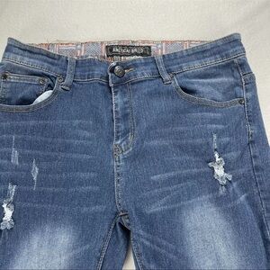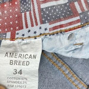Show off your patriotic side with these American Breed skinny boyfriend jeans in dark blue. The distressed denim and solid pattern add a unique touch to these jeans, making them perfect for any festival, school, winter, or college outfit. The low rise and slimming fit make these jeans flattering for any body type, while the stretch fabric ensures comfort throughout the day. These jeans are available in size 34x32 and feature a 31.5 inch inseam. Add a touch of style to your wardrobe with these American Breed jeans.