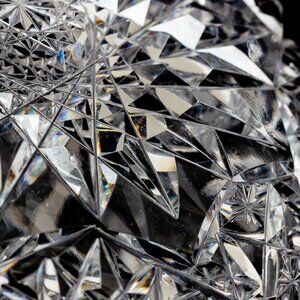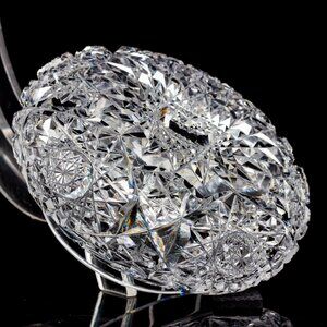 This exquisite American Brilliant Cut Crystal Vanity Jar adds a touch of elegance and sophistication to any decor. This is a piece that recalls the silver age of Hollywood. Its intricate design and shimmering facets make it a valuable addition to your collection.
