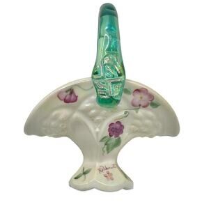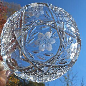 American Brilliant Period Vintage Cut Glass Candy Dish w Handle Collectible Gifts Small dish Christmas Gift idea Gift for her or him Gorgeous piece of cut glass is not crystal leaded glass dish is about 6 inches and will measure asap. ABP glass was made by cutting tools by some of the great glass makers. This one has the glass flower etching on it. Heavy item. I also have the vase in this pattern if anyone is interested.