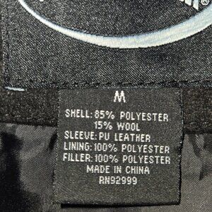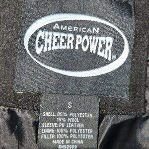 The American Cheer Power National Champion Jacket is a stylish and versatile piece made of wool with a polyester lining, and Leather sleeves providing insulation for colder seasons. The varsity jacket features long sleeves, a snap closure, and embroidered accents, making it perfect for various Cheer events for school to casual outings. With its classic black body and gray leather sleeves it makes it a touch of preppy style, this jacket is a must-have for those looking to add a piece of American spirit to their wardrobe. ***** I have 1 Small and 1 Medium *****