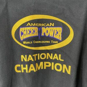 This is a youth-sized American Cheer Power varsity jacket made of wool with a nylon lining, featuring an embroidered design. The jacket is mid-length with long sleeves, a snap closure, and a black color. It has a chest size of 46 and is a size L. This jacket is suitable for travel, activewear, or casual wear, and is designed with pockets, a collared neckline, and a soft shell for added comfort. It is recommended to be dry cleaned only.