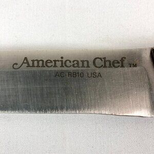 This slicing knife has a model number of AC-RB10 and has a riveted wood handle. It is in good used condition.