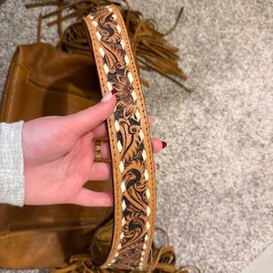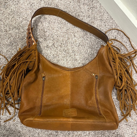 Turn heads with this stunning American Darling shoulder bag, crafted from genuine brown leather and finished with dramatic fringe detailing on both sides. The front features two vertical zippered pockets and a wide, patterned shoulder strap for comfort and style. The embossed American Darling logo adds an authentic Western touch.