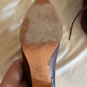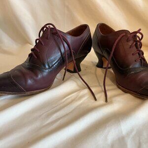 Sleek and stylish genuine leather reproduction heels from American Duchess! In their cherry color, a lovely burgundy lace-up oxford heel, with a pointed toe and a narrow toe box! They are preowned and have been worn, with some wear to the sole, which is made of smooth untextured leather.