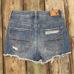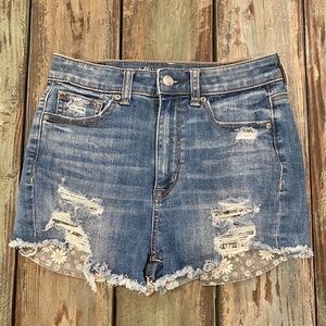 American Eagle Outfitters AEO Size 2 Highest Rise Shortie Denim Festival Women’s Stretchy Shorts, Exposed Floral Pockets, Distressed. Preowned. Nice condition. Waist measures approx 26”. Inseam measures approx 2.25”. Rise measures approx 11”. Factory applied whiskering, distressing, and fade. Super cute festival shorts with peek-a-boo floral print pockets.