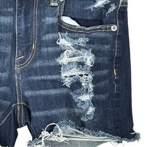 These American Eagle 360 Super Stretch hi-rise denim shorts in size 2 are a stylish addition to any casual wardrobe. Dark wash with distressed detailing and a raw hem, they offer a trendy, retro vibe perfect for vacation or everyday wear. Made from a comfortable blend of 71% cotton, 14% viscose, 11% polyester, and 4% elastane, these shorts provide a flattering 360° stretch fit. Excellent preowned condition from a smoke-free home. Approximate flat lay measurements: waist 13.25", rise 8.75", inseam 4.5". Machine washable for easy care. Ideal for pairing with crop tops, tees, or casual tanks.