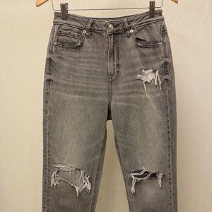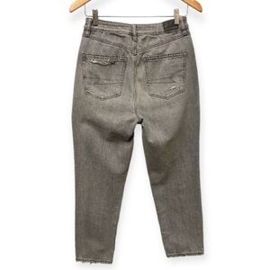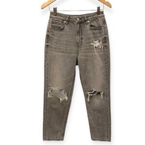 American Eagle Outfitters AEO Size 4 Short Mom Jeans, Gray, High Rise, Women’s, Distressed, Frayed Hems. Preowned. Nice condition. No stains or flaws. 2022.