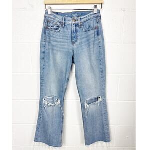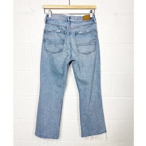 Vintage-inspired '90s bootcut jeans by American Eagle. Features a light wash, distressed knees, and raw hem for a laid-back, worn-in look.