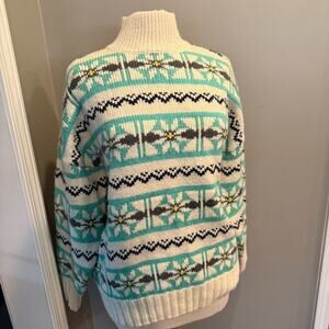 Description: Soft and thick oversized sweater; classic Fair Isle snowflake pattern in cream, teal, yellow, gray, and navy; cozy mock neck; ribbed trim; relaxed fit