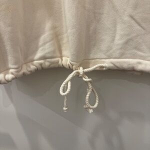 Gently used, American Eagle AE cream colored henley long sleeve pullover. Sweatshirt features a drawstring cinching at the bottom. Three Henry style buttons at the top makes this super soft fleece sweater is perfect for a cozy night in or casual errands.