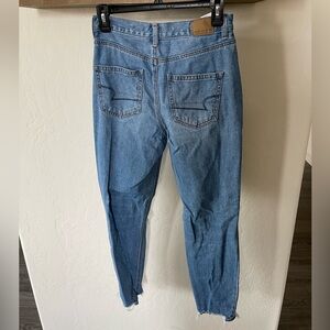 Beautiful women’s AE American Eagle Mom Jeans in light wash with distressed, ripped knee—size 2•••