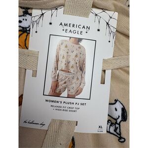 American Eagle AE Peanuts Snoopy Fall Pumpkin Plush PJ Set NWT XL. New with tags. Get ready for a cozy night in with this American Eagle AE x Peanuts Fall Pumpkin Snoopy Plush Pajama Set. This cute and comfy pajama set features a long sleeve crop top with a cream/orange color - perfect for any Peanuts fan. Matching high rise shorts. 95% polyester. All items from smoke free, pet friendly home. Open to offers and bundle for a discount!
